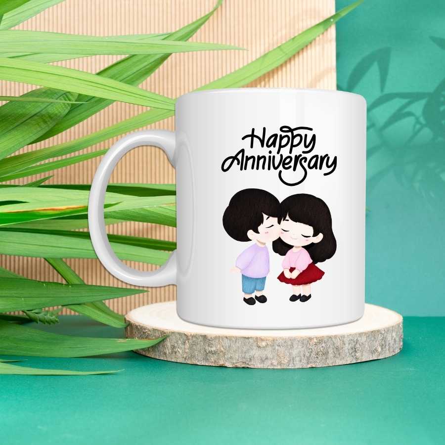 A romantic couple printed happy anniversary coffee mug designed to celebrate love beautifully.